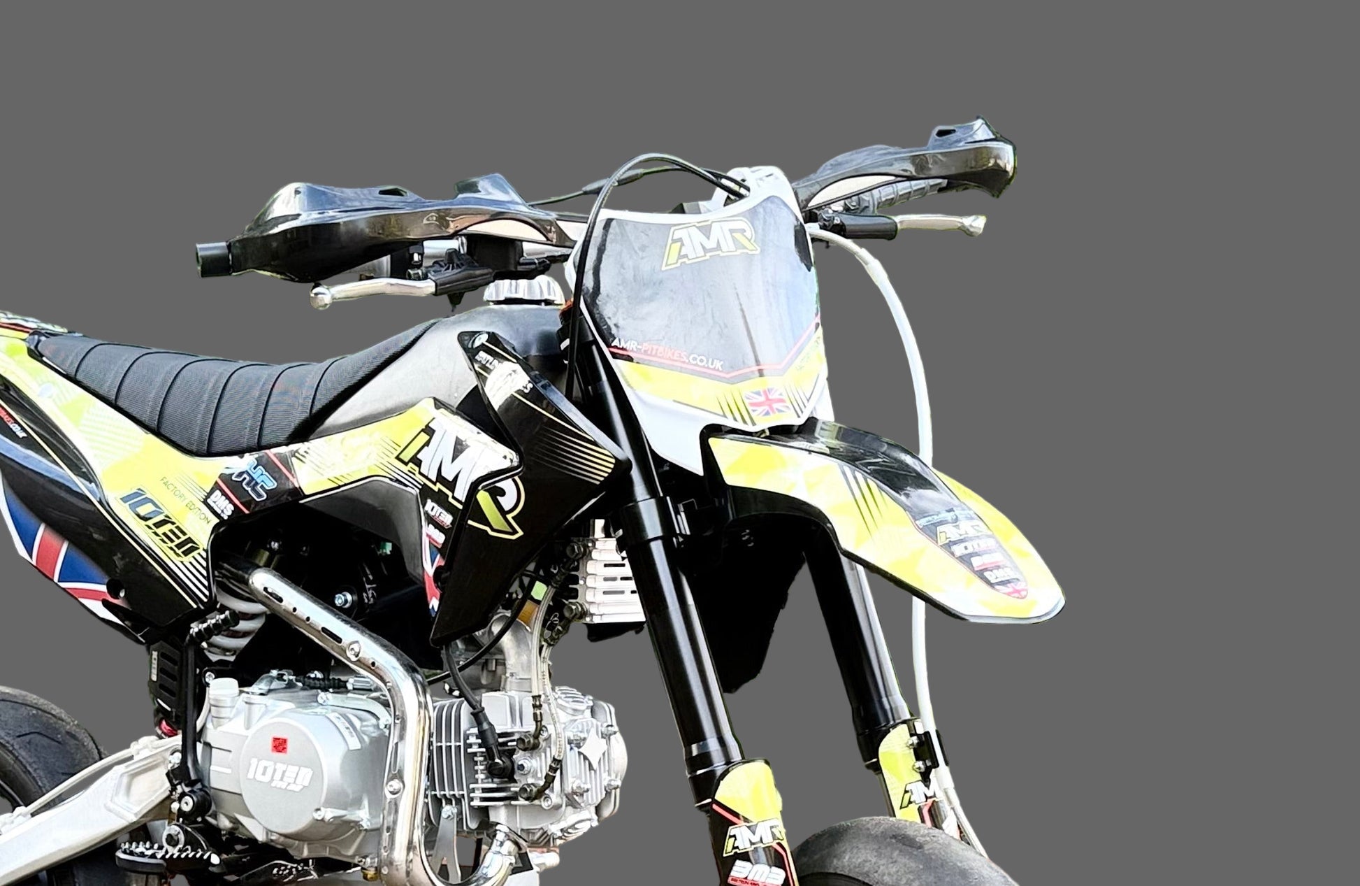 The AMR-2 Moto 140 Supermoto Motard Edition by AMR is the ULTIMATE race ready supermoto pit bike. The AMR-2 offers an SDG2 heavy duty cradle frame for ultimate stiffness and control with improved engine mounts and higher foot pegs as standard